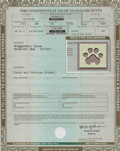 On the morning of April 3, the Title to the WiggleBus came in the mail.  After the proper havoc that must be raised by respectable canine citizens when the post man arrives, Henry and Guinness sat together and breathed big impatient dog breaths.