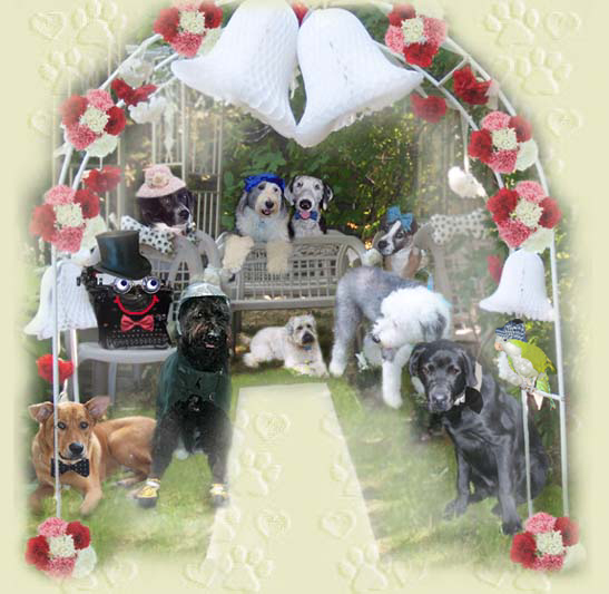 terriers decorated the yard with flowers, ribbons and bows.