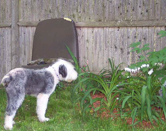 ` When, at long last, they arrived home, Auntie Molly took the puppy out to do his "business".  He sniffed around the entire yard, looking at all the wonderful things.