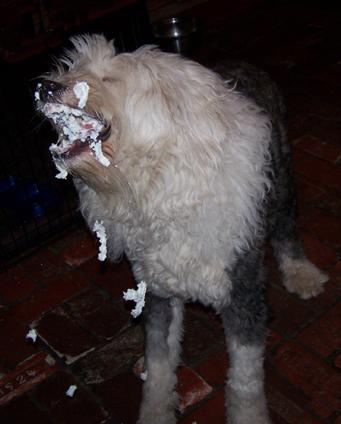 Molly got a big glob of whipped cream on her face.  She was able to lick it off everywhere except for the top of her snout!