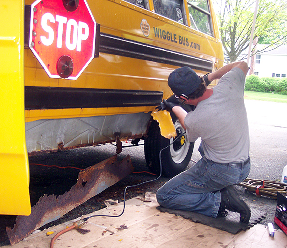 The sheepies were also under strict orders to stay inside, away from the driveway "operating room".  Michael knew it would be upsetting for them to see Wigglebus in surgery. As he worked away, the only sound that could be heard was the reciprico saw buzzing away Wiggle's bad spots.